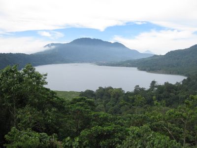 El lago Tamblingan se encuentra dentro de una caldera volcánica a unos 1.200 metros de altitud y está rodeado de bosque denso. El cuerpo de agua tiene dos cuencas distintas con restos arqueológicos y templos en sus orillas.
