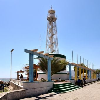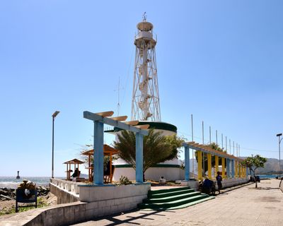 El Faro del Puerto de Dili se eleva 19 metros desde una base de mampostería, con una torre esquelética metálica octagonal con linterna y galería.