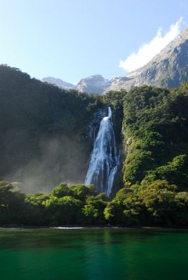 Bowen Falls cae 162 metros directamente en Milford Sound, creando una columna de agua que se precipita desde terreno rocoso empinado. El agua fluye desde el río Bowen y forma una de las características más visibles del fiordo.