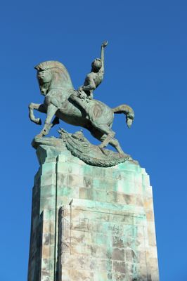 La figura central de bronce representa La Voluntad de Paz, mostrando a Pegaso elevándose hacia los cielos mientras rechaza los elementos de guerra.