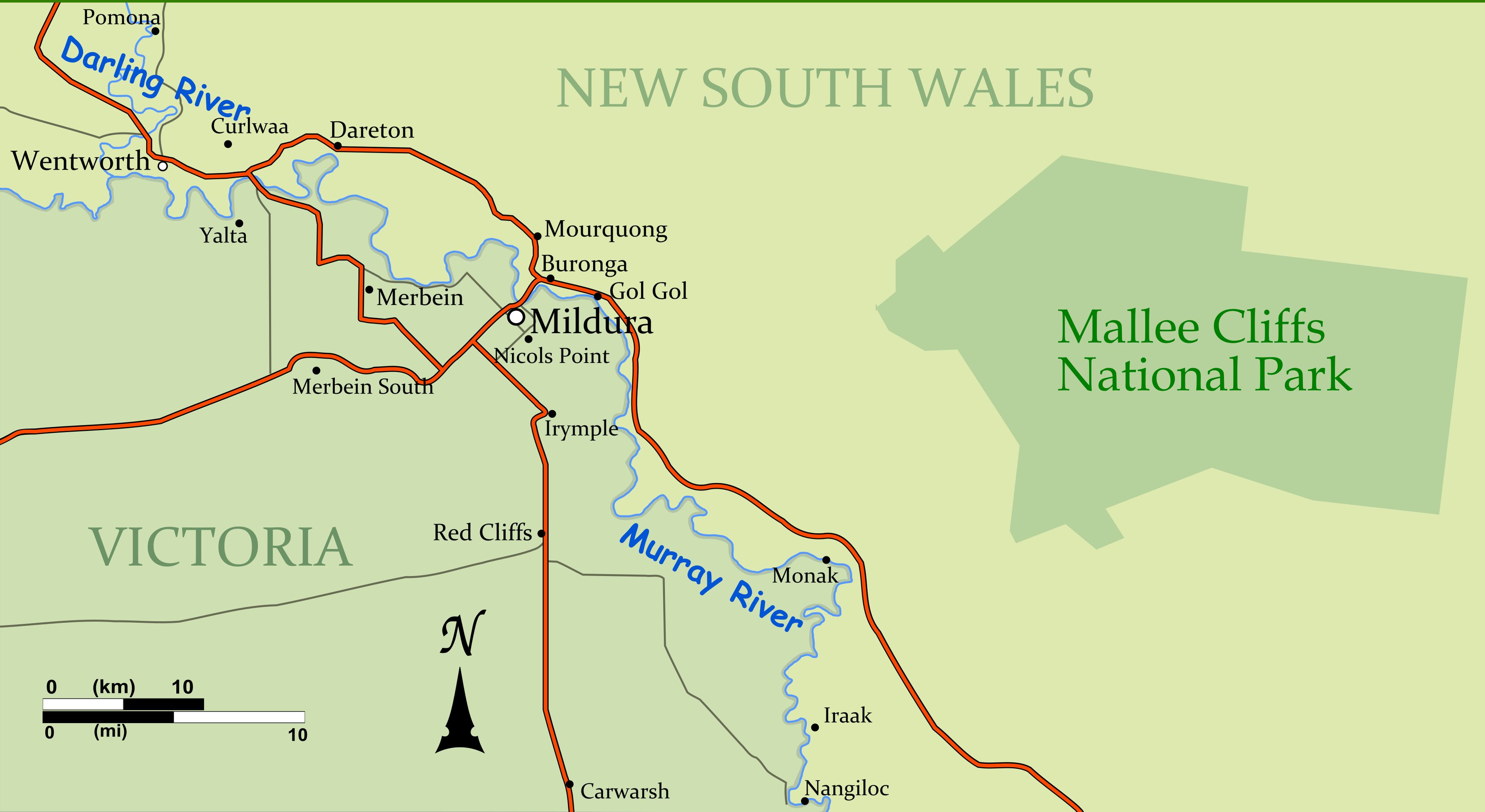 El Parque Nacional Acantilados Mallee abarca 57.969 hectáreas de llanuras arenosas rojas y dunas lineales en la región de Wentworth.