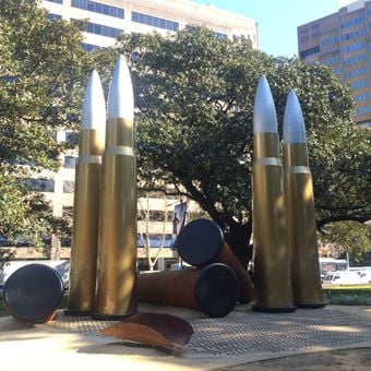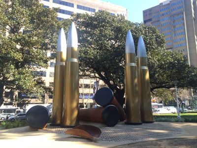 El monumento presenta cuatro balas altas de aluminio, mármol negro y acero, junto a tres casquillos caídos sobre una base en forma de bumerán.