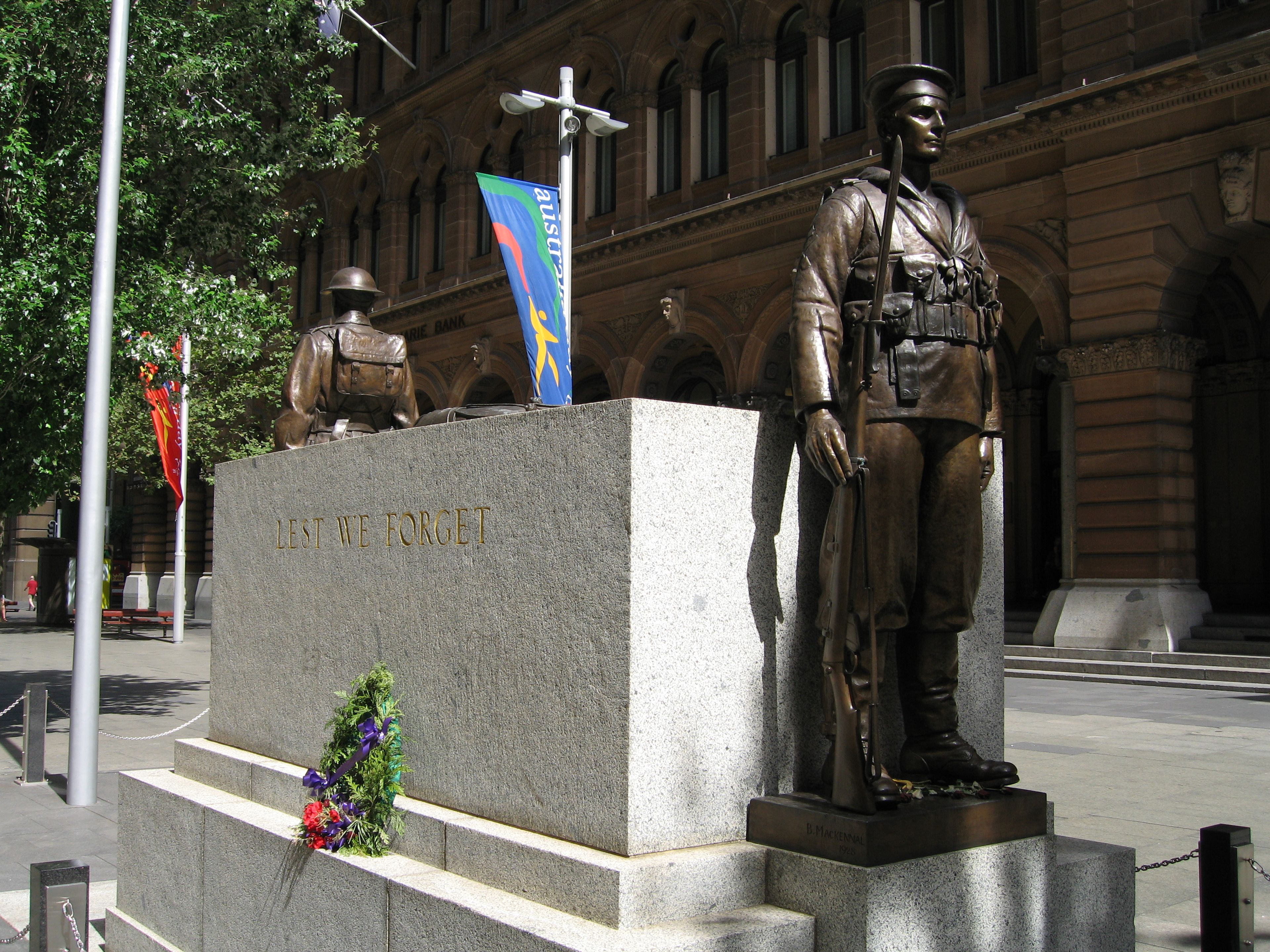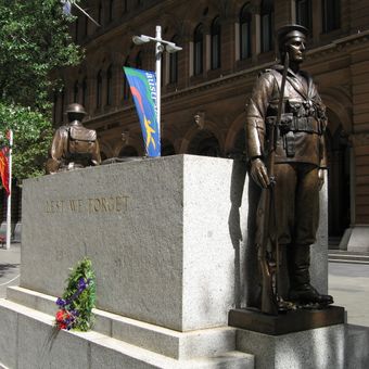 El Cenotafio de Sídney presenta un bloque monolítico de piedra con estatuas de bronce de un soldado y un marinero en los extremos.