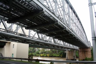 La estructura incluye un paso peatonal en el lado superior, permitiendo a las personas cruzar el río Brisbane junto al tráfico ferroviario.