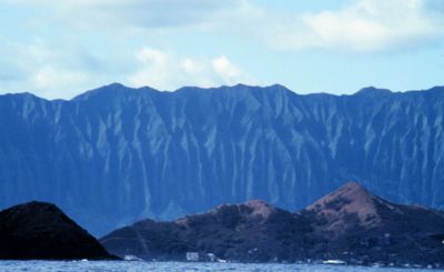 La cordillera Koolau se extiende por el este de Oahu a lo largo de 60 kilómetros, con acantilados que se elevan entre 150 y 750 metros.
