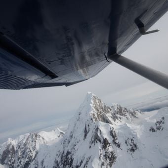 El Monte Huntington alcanza 3.731 metros de altura con paredes empinadas de roca y hielo que se elevan desde el glaciar Tokositna.