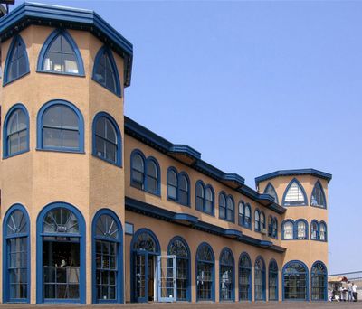 El Looff Hippodrome de Santa Mónica presenta elementos arquitectónicos bizantinos y moriscos con torres octogonales, ventanas triangulares y una cúpula central.