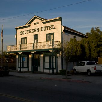 El Southern Hotel es una estructura de madera de dos pisos construida en 1886 que presenta arquitectura de Renacimiento Italiano con coronas decorativas en las ventanas y un porche abierto al frente. Su revestimiento horizontal y forma rectangular simple muestran detalles italianos característicos de la construcción del siglo diecinueve tardío en la calle D.