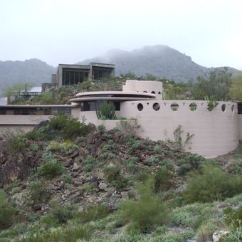 La residencia demuestra los principios de la arquitectura orgánica mediante sus formas geométricas y su integración con el entorno natural del desierto.