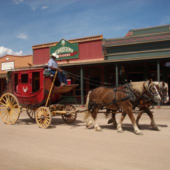 Tombstone es una ciudad minera en el condado de Cochise, Arizona, Estados Unidos, que conserva su trazado original de la década de 1880 con aceras de madera y edificios de fachada falsa. La avenida principal presenta tabernas, comercios con letreros pintados a mano y construcciones de adobe y madera que reflejan la arquitectura de la época de la fiebre de la plata.