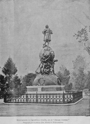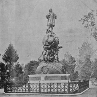 El Monumento a Cristóbal Colón presenta una estatua de bronce del navegante sobre un pedestal de piedra con elementos decorativos e inscripciones.