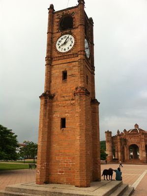El parque contiene una torre del reloj de estilo mudéjar y una fuente histórica que marcan la intersección de cuatro paseos peatonales dentro del recinto.