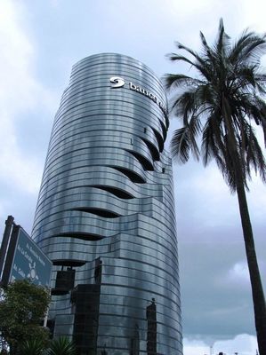 La Torre Urban Plaza presenta un diseño cilíndrico cubierto de vidrio templado curvo, granito y elementos de acero que alcanza 16 pisos.