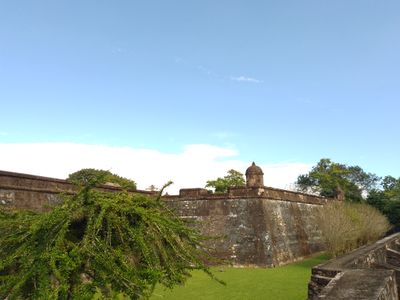 La fortaleza de piedra abarca 4.400 metros cuadrados junto al Mar Caribe, con gruesos muros de piedra caliza y bastiones defensivos.