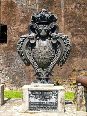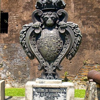 El museo de la fortaleza expone artefactos militares del período colonial, incluyendo cascos, armas y el Escudo Real Español en su entrada.