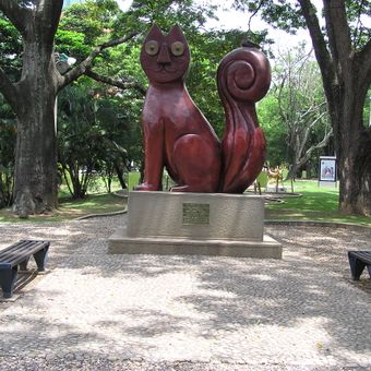 El Gato del Rio es una escultura de bronce junto a la orilla del río Cali en Colombia. La figura muestra un gato estilizado con formas geométricas angulares que se alza sobre un pedestal en el malecón fluvial.