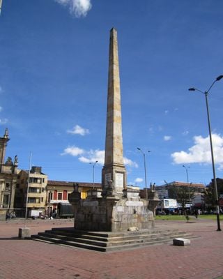El Obelisco a Los Mártires es un monumento de piedra ubicado en la intersección de la Avenida Caracas con las calles 9 y 10 en el centro de Bogotá. Su forma vertical destaca entre los edificios circundantes y el movimiento de la ciudad.