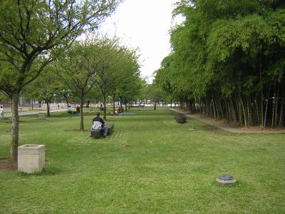 El parque contiene múltiples zonas con diferentes texturas, incluyendo áreas de arena, jardines de bambú, fuentes de agua y secciones de césped.