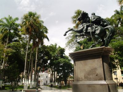 Plaza Bolívar es una plaza pública en el centro de Barquisimeto con una estatua ecuestre central de Simón Bolívar, rodeada de paseos, asientos y jardines plantados. El espacio incluye varios caminos y rincones tranquilos para que los visitantes descansen.