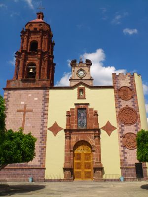 La Parroquia de la Purísima Concepción presenta una torre alta y esbelta construida en cantera roja con una nave principal de planta cruz latina.