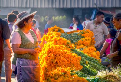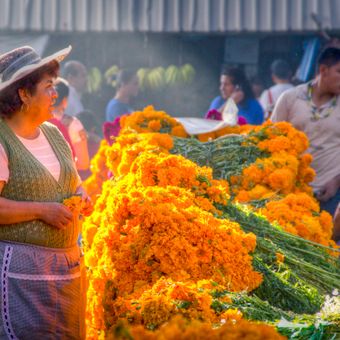 Durante las celebraciones del Día de Muertos, el mercado se convierte en fuente principal de cempasúchil y arreglos florales para altares tradicionales.