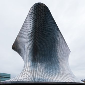 El edificio del museo se eleva a lo largo de seis plantas con un exterior revestido de 17.000 baldosas hexagonales de aluminio que reflejan la luz solar durante todo el día, otorgando a la estructura su apariencia plateada distintiva.