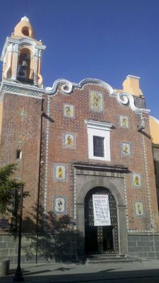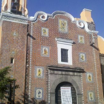 El templo exhibe una fachada frontal decorada con nueve paneles de talavera que representan figuras religiosas entre ladrillos rojos y azulejos azules.
