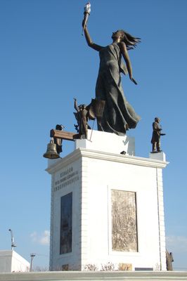 El monumento de 20 metros presenta una figura femenina central sosteniendo una antorcha, acompañada por representaciones de héroes y relieves en bronce.