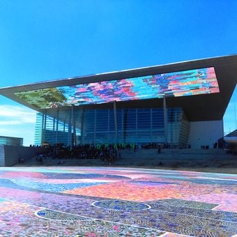El Teatro Auditorio Gota de Plata presenta una cubierta de cristal reflectante a 25 metros de altura que refleja los colores del mural adyacente.
