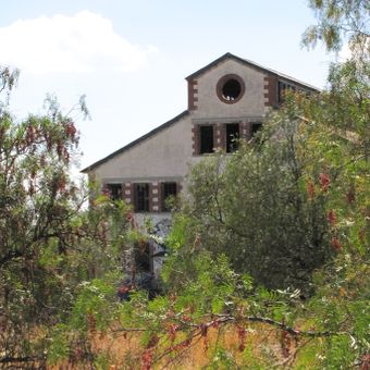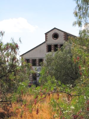 La estructura industrial de gran tamaño presenta tres niveles con fachadas laterales idénticas, ventanas verticales y pilastras esquineras de bloques de piedra.