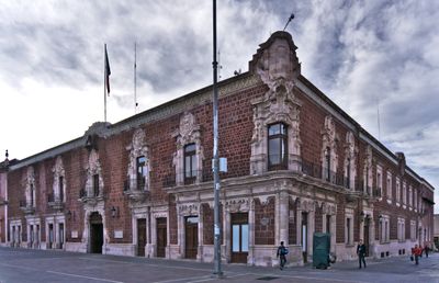 El Palacio de Gobierno presenta muros de tezontle rojo con balcones de cantera rosa y cinco blasones en su fachada de arquitectura barroca.