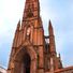 La estructura incorpora piedra de cantera rosa y naranja en su construcción, con cuatro rosetones integrados en su diseño neogótico.