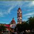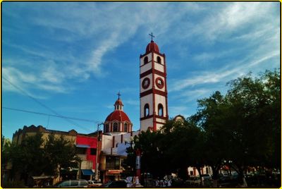 La Catedral del Sagrado Corazón de Jesús presenta una torre de tres cuerpos con una cúpula coronada por una cruz de hierro y un reloj.