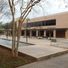 La entrada presenta una escultura de David Cargill junto a una fuente con espejo de agua, estableciendo un espacio dedicado para la reunión de visitantes.
