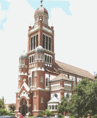 La Catedral de San Juan Evangelista presenta arquitectura románica holandesa con una gran fachada de ladrillo rojo y blanco en Calle Catedral 515.
