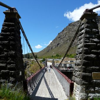 El Puente Colgante del Desfiladero Kawarau se extiende 120 metros sobre el río Kawarau, alcanzando una altura de 43 metros sobre el nivel del agua.