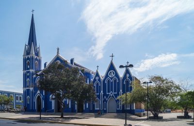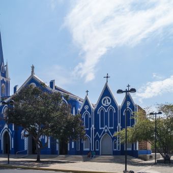 Las paredes exteriores muestran un esquema de color azul intenso que distingue este edificio religioso de otras estructuras en el paisaje arquitectónico venezolano.