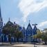 La iglesia pintada de azul presenta arcos puntiagudos, líneas verticales y detalles arquitectónicos ornamentados característicos del diseño neogótico en Avenida 8 y Calle 95.