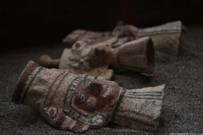 El sitio de excavación contiene una pared norte de 8 metros con un banco decorado que muestra frisos pintados y motivos alternados de calaveras y corazones.