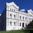 La estructura de piedra caliza presenta arquitectura neorrománica de influencia alemana con arcos redondeados y almenas en las paredes exteriores.