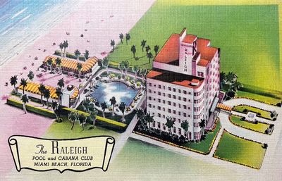 El Hotel Raleigh es un edificio Art Deco en Collins Avenue que presenta curvas fluidas, patrones geométricos y líneas horizontales en toda su estructura. El edificio muestra elementos Streamline Moderne en los espacios exteriores e interiores con atención cuidadosa al detalle arquitectónico.