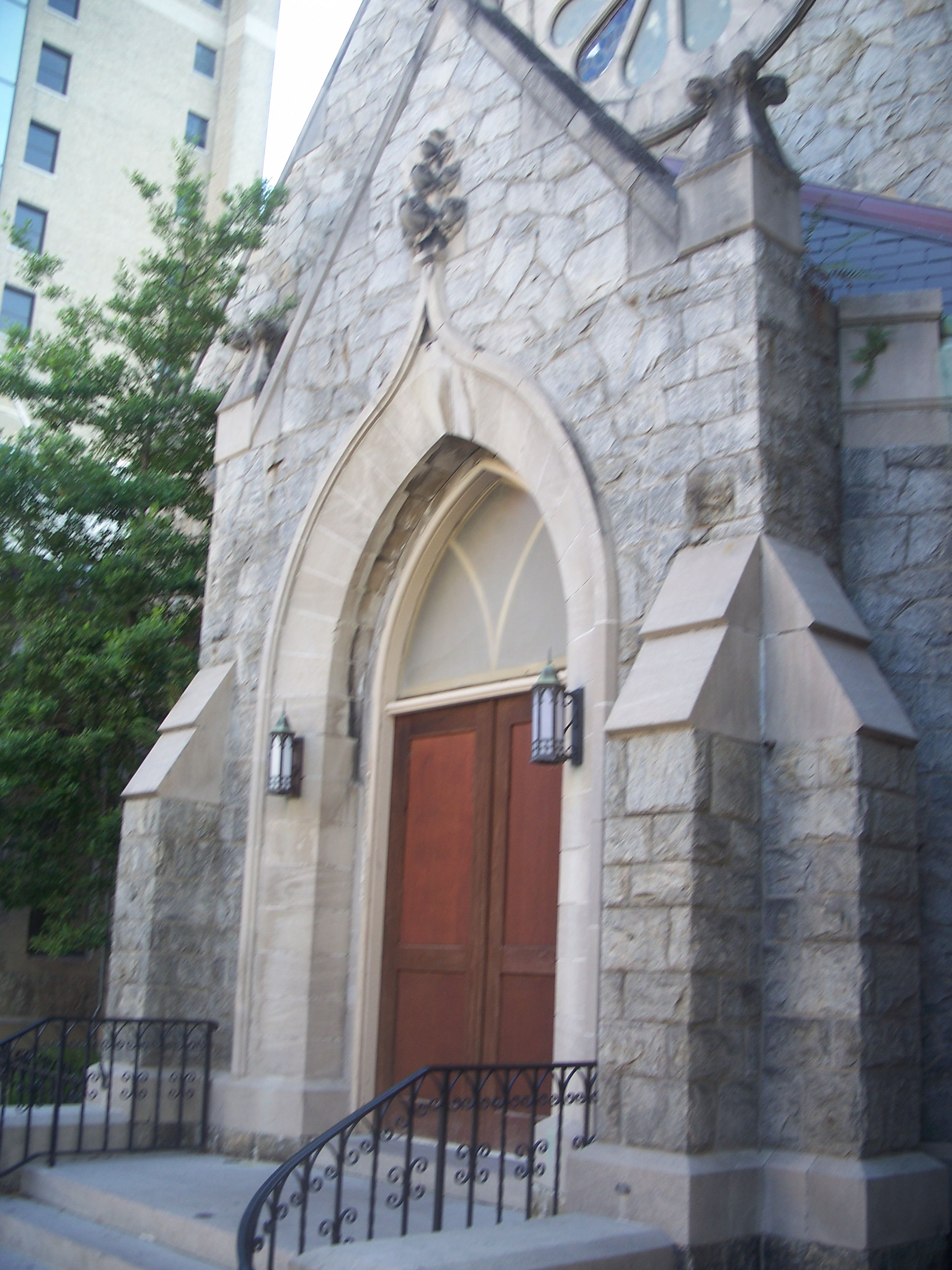 La Iglesia Episcopal Metodista Memorial Snyder presenta una torre campanario almenada y rosetón frente al Parque James Weldon Johnson.