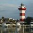 El Faro de Harbour Town muestra franjas rojas y blancas y se alza al final de un puerto deportivo bordeado de tiendas y restaurantes junto al agua. Los visitantes suben la escalera de caracol para contemplar la costa y los veleros fondeados.