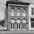 El Farmers' and Exchange Bank exhibe tres bahías con altas aberturas arqueadas, ventanas circulares y una fachada de piedra arenisca multicolor y ladrillo.