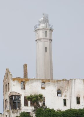 La torre de hormigón blanco se eleva 84 pies desde el punto más alto de la Isla de Alcatraz, con forma octagonal, balcón y sección de linterna.