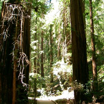 Muir Woods es un área protegida de secuoyas costeras en el condado de Marin, al norte de San Francisco, donde el denso follaje de árboles de varios cientos de años da sombra a los valles. Los árboles alcanzan más de 75 metros de altura y forman un dosel cerrado, mientras un arroyo poco profundo recorre el suelo y mantiene húmeda la tierra del bosque.