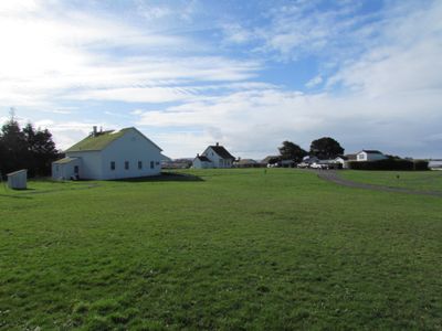 El parque estatal presenta edificios militares originales, una estructura hospitalaria y exposiciones de equipos forestales en un acantilado con vistas a la Bahía Humboldt.