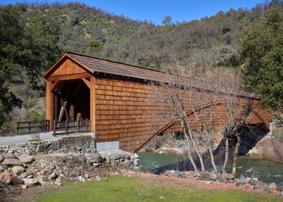 El puente cubierto de Bridgeport se extiende 233 pies sobre el río South Yuba, con un diseño de armadura Howe y un sistema de arco auxiliar.