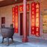 La sección del Templo Luna presenta una puerta circular y exhibe estatuas que representan principios budistas, con decoraciones rojas que simbolizan la fortuna.