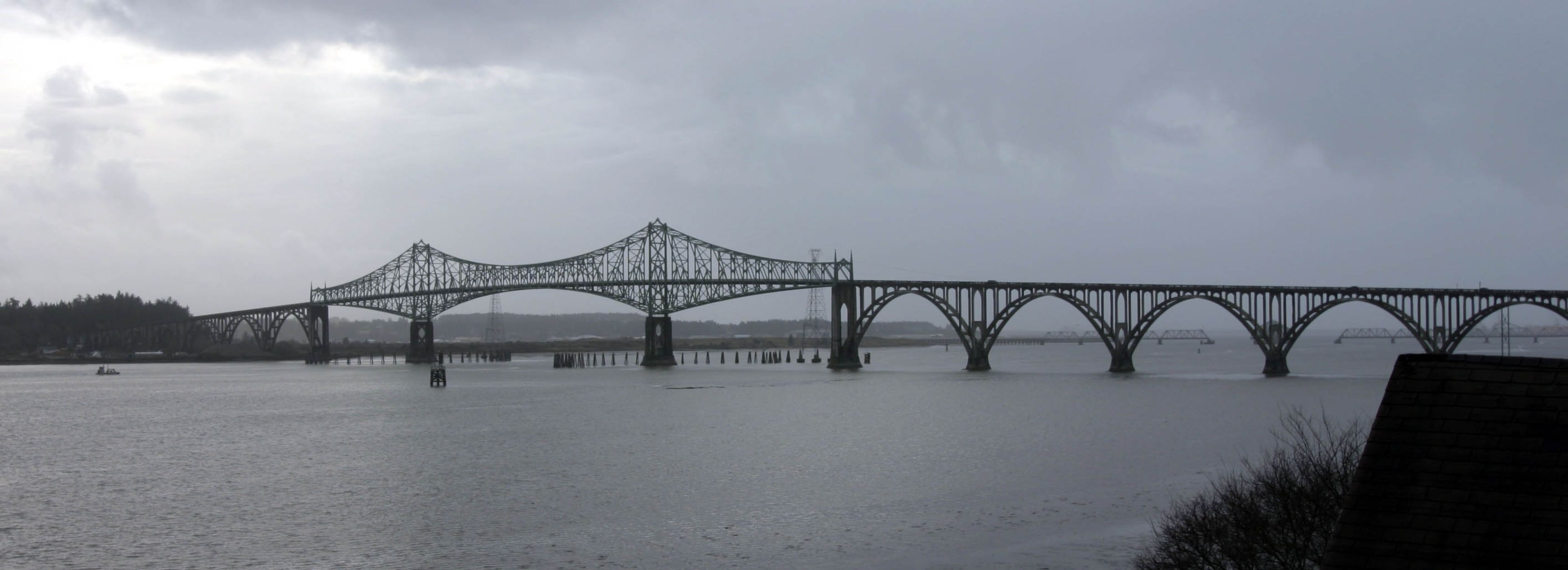 El Puente Memorial Conde McCullough se extiende 1,617 metros sobre la bahía de Coos, con cerchas de acero sostenidas por pilares de piedra.